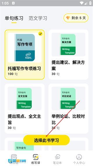 在写译页面选定学习内容后,点击【选择此书学习】按钮,即可进入对应的练习模块。