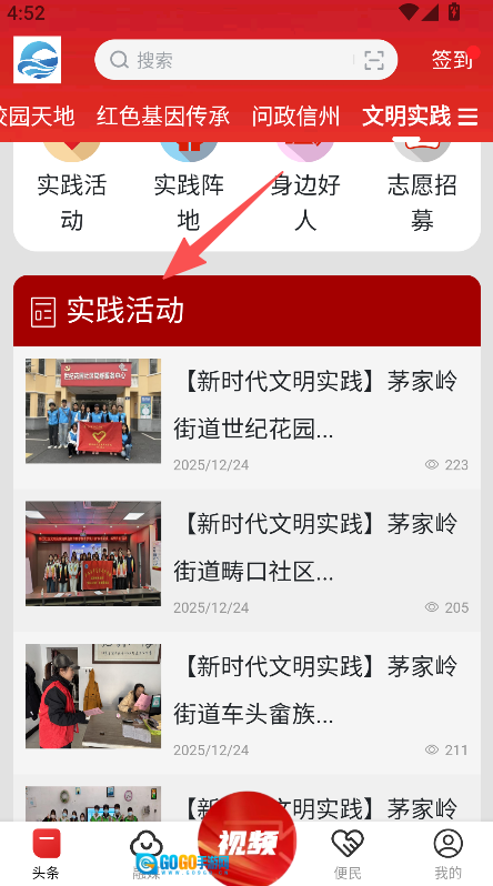 设多类板块含校园天地、文明实践等,展示民生动态与实践活动,适配本地资讯及实践参与的多元需求。
