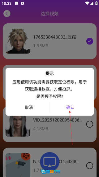 投屏过程中若出现权限提示,点击【确认】按钮同意授予定位权限,就能顺利完成投屏操作。