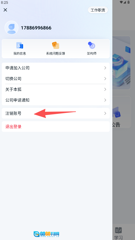 进入“工作职责”界面后,向下滚动页面找到“注销账号”选项。