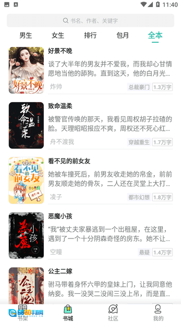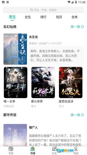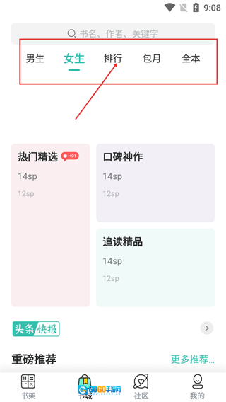进入【书城】界面后,可通过【男生】【女生】【排行】【包月】【全本】这些选项切换分类,接着点击【排行】进入即可。