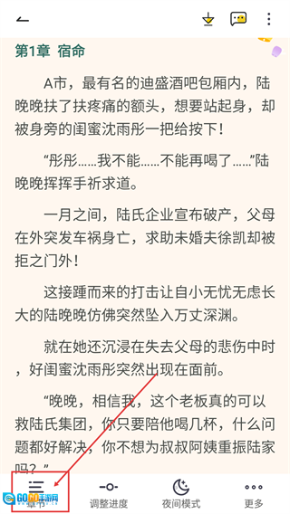 在章节阅读页面,通过【章存】功能记录当前的阅读进度,再利用【调整进度-夜间模式】来优化阅读时的舒适体验。