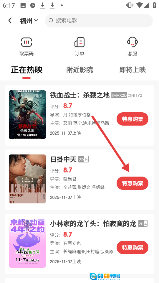 在【正在热映】的影片列表里,找到《日掛中天》这部电影,然后点击对应的【特惠购票】按钮。