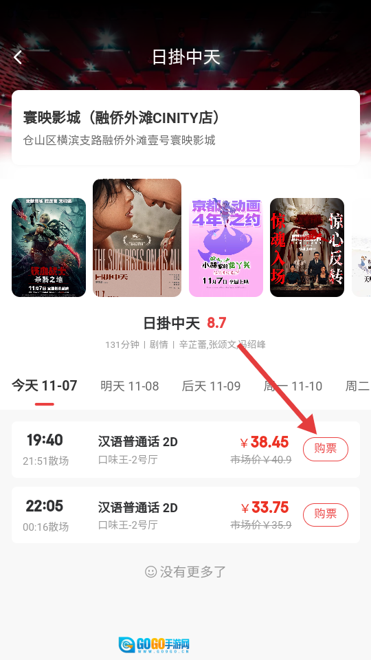 在影城场次页面,挑选合适的场次后点击【购票】按钮就可以了。