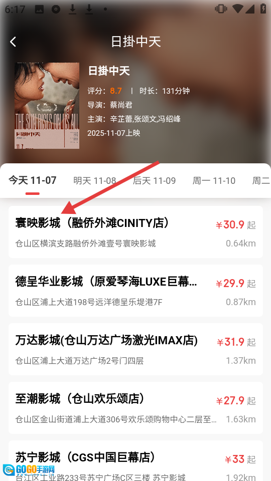 在《日掛中天》的影城选择页面,点击【寰映影城(融侨外滩CINITY店)】。