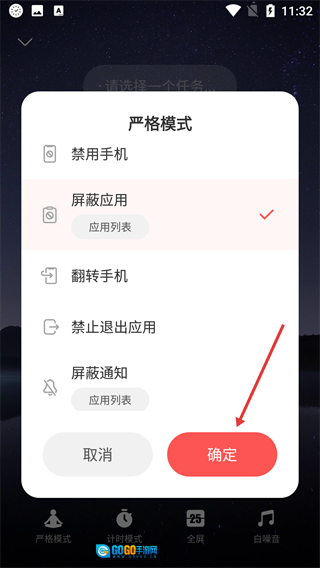 在【严格模式】的设置弹窗里,点击【屏蔽应用】所对应的权限选项。