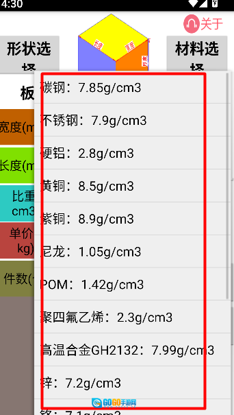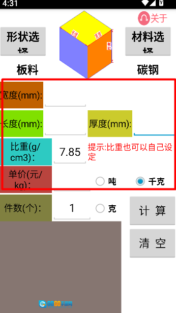 填写长、宽、厚和比重等参数,点击计算即可。