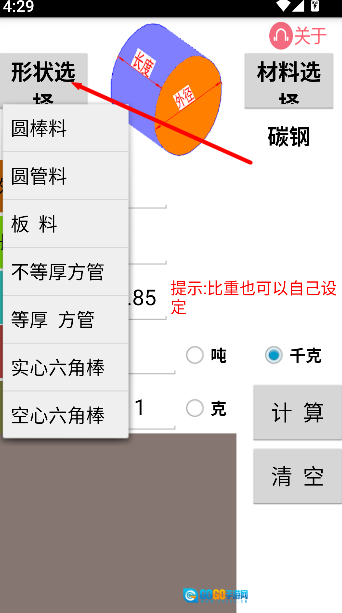 首先选择所需计算的材料形状。