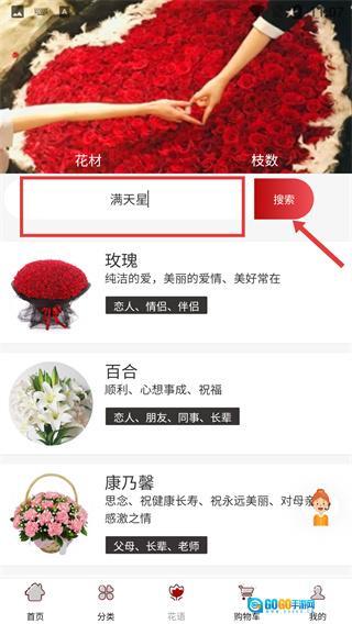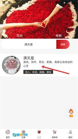 进入花语页面后,在搜索框中输入“满天星”,接着点击“搜索”按钮,即可查询到该花材所对应的花语内容。