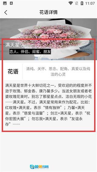 在满天星花语的详情页面,你能知晓它的花语含义,以及和其他花材搭配时所蕴含的寓意,从而帮助你做出选花的决定。