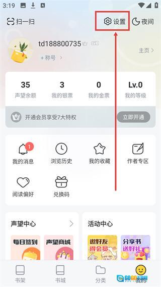 在书城页面点击底部的【我的】选项,即可进入个人功能页面。