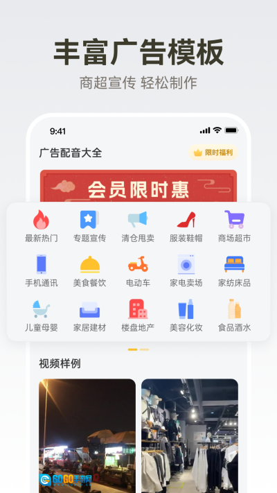 广告促销相关的配音服务,涵盖地摊吆喝叫卖、商场促销宣传、小吃摊揽客叫卖等各类线下商户的促销场景配音需求。