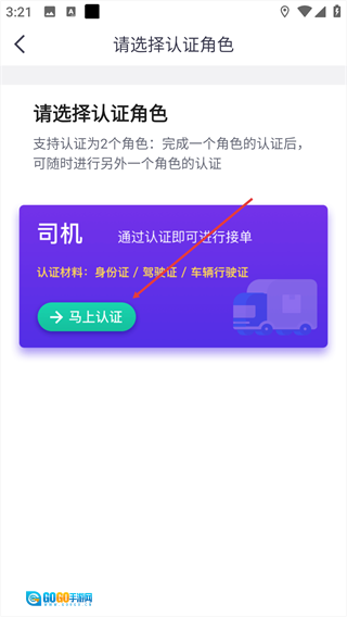 选定【司机】角色,点击对应的【马上认证】按钮。
