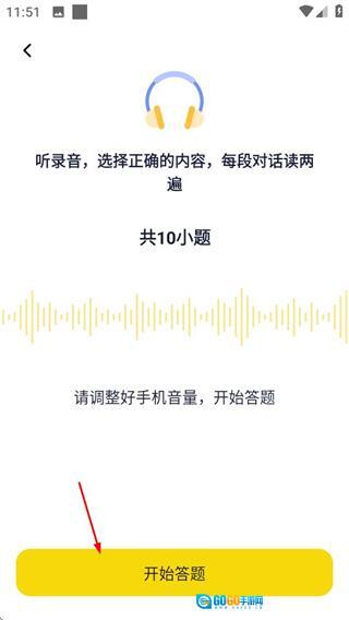 在听力练习页面,点击“去练听力”按钮,即可进入听力答题准备页面。