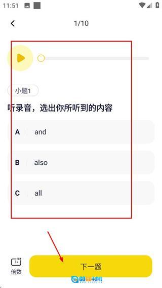 在答题界面,做完当前题目后点击下一题按钮,就能继续完成后面的听力题目。