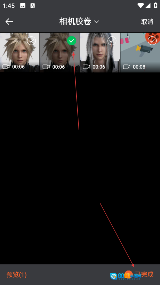 在相机胶卷页面,勾选【目标视频】后点击【已完成】按钮,即可进入滤镜编辑界面。