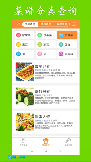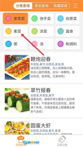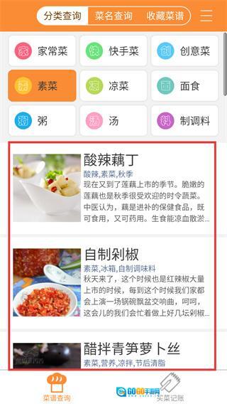 在分类查询页面点击【素菜】标签,即可切换到素菜类菜谱列表,查看该分类下的相关菜品内容。