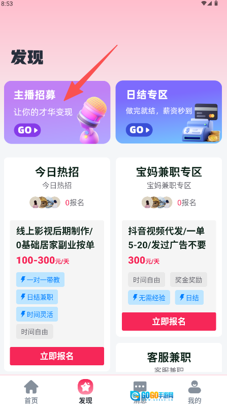 在页面里找到“主播招募”板块,然后点击它右边的“GO”按钮。