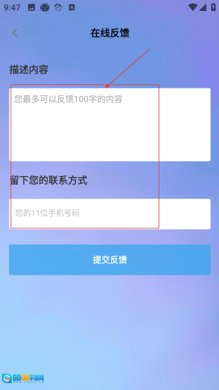 在在线反馈页面,填写【描述内容与联系方式】,准备提交反馈。