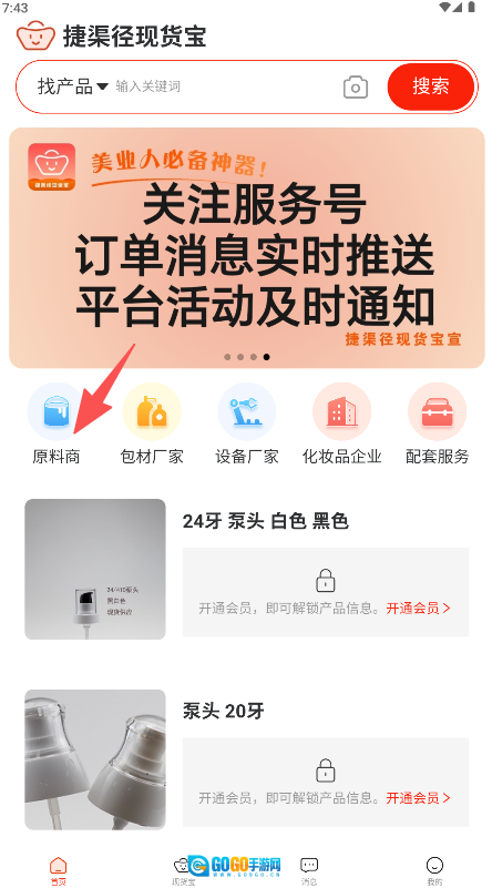 在应用首页点击“原料商”图标,即可进入供应商筛选页面。