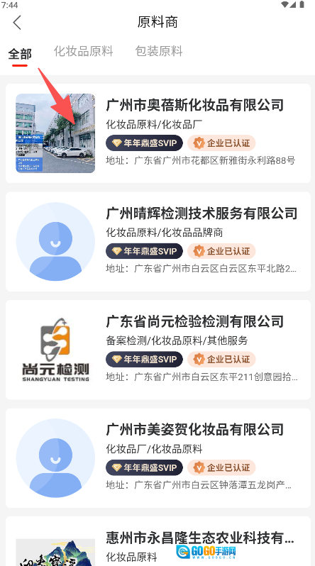 在供应商列表中选择目标企业点击进入。