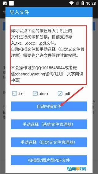 在导入文件的弹窗里,点击“自动扫描文件”按钮,就能启动对手机内所有支持格式文件的扫描操作。
