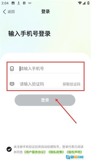 在【输入手机号登录】页面,填写【请输入手机号】和【请输入验证码】这两个输入框,勾选相关协议后点击【登录】按钮,即可完成登录操作。