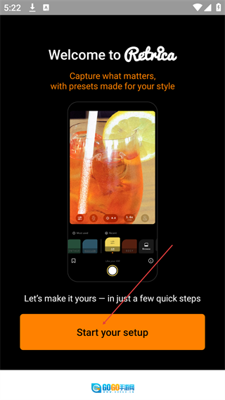 打开Retrica应用后,在欢迎页面点击“Start your setup”按钮完成初始设置,即可进入拍摄主界面。