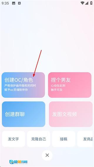 1、在芋泥OC首页,点击底部的+按钮,展开功能选择菜单。
