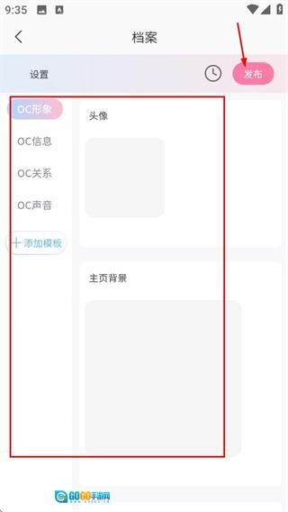 3、进入档案页面后,先完善OC相关信息,再点击发布按钮,就能完成OC的创建操作。