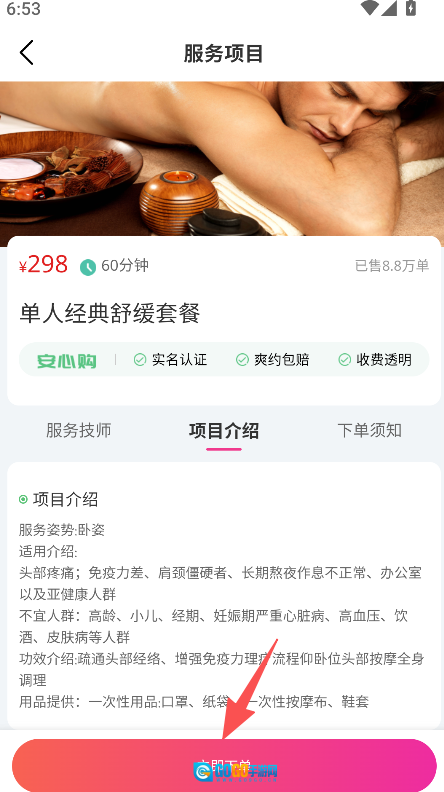 查看项目介绍选定技师后点击立即下单。