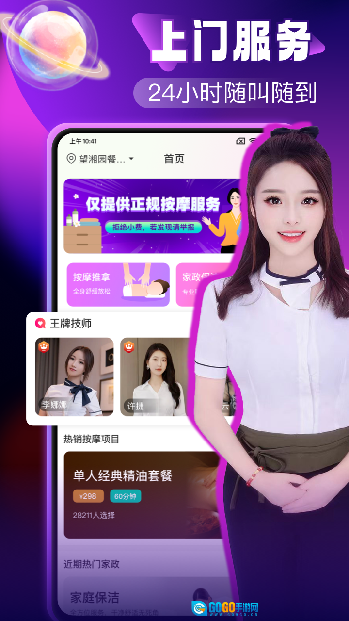 包含按摩推拿与家政保洁两项服务,按摩板块可带来全身的舒缓放松体验,家政板块则能提供专业且省力的服务支持。