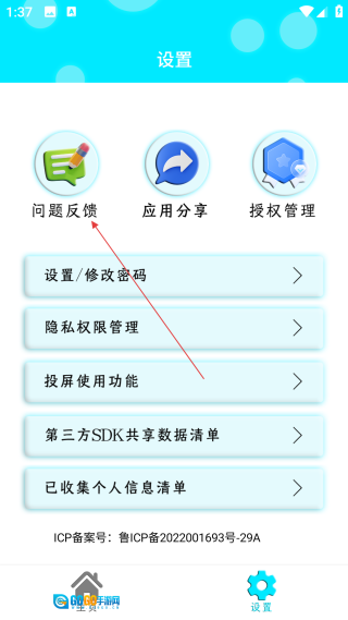 在设置页面中,找到并点击【问题反馈】选项,即可进入建议反馈的内容填写界面。