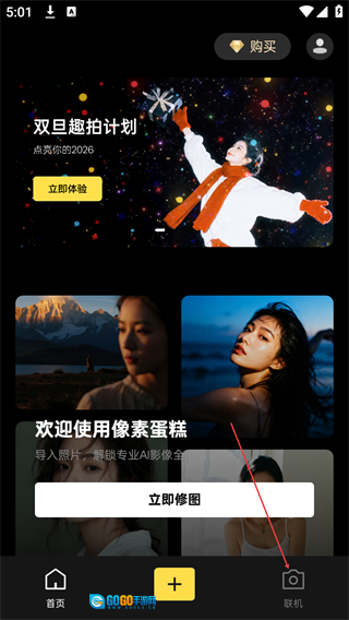 打开“像素蛋糕”应用的首页后,点击底部导航栏中的“联机”选项,即可进入个人中心页面。