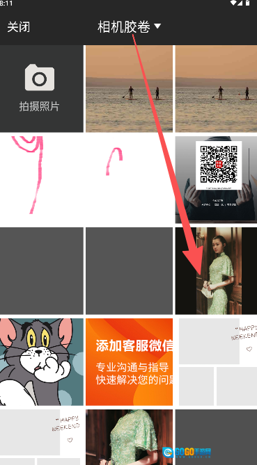 从相册图库中挑选出想要的照片,就像示例里那张身着绿色旗袍的女士图片一样。