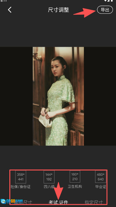 在尺寸面板里挑选你需要的预设尺寸,确认好之后点击“导出”按钮,这样就能完成处理了。