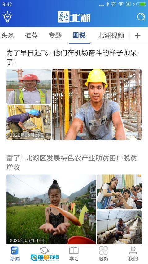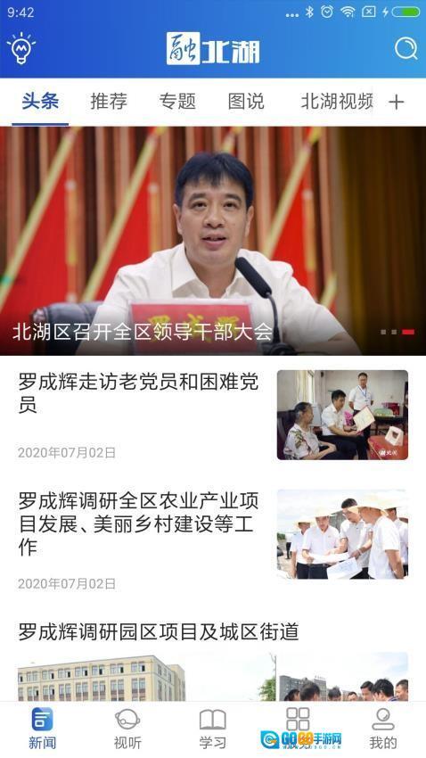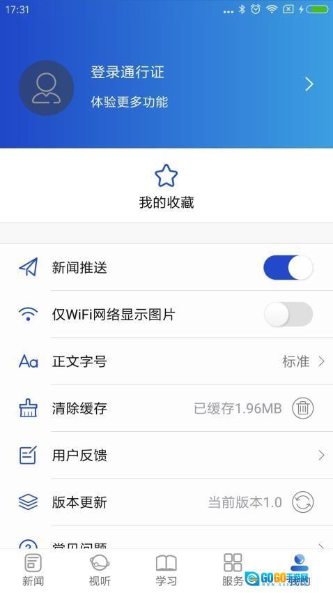底部设有新闻、视听、学习、服务、我的等板块,各功能板块区分明确,方便用户快速切换至不同功能区域。