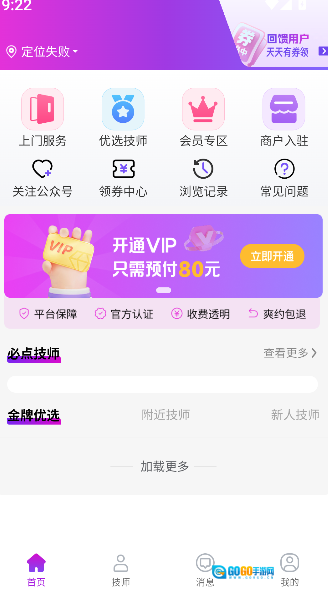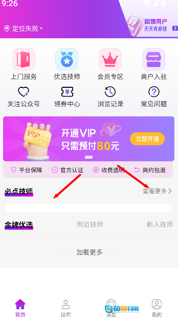 打开《花都上门按摩》,进入首页后点击必点技师板块,选择查看更多进入技师展示页面。