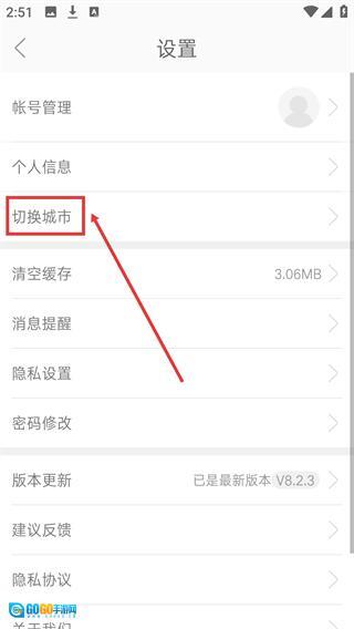 进入【设置】页面后,找到并点击【切换城市】选项,就能进入城市切换界面,完成城市站点的更换操作。