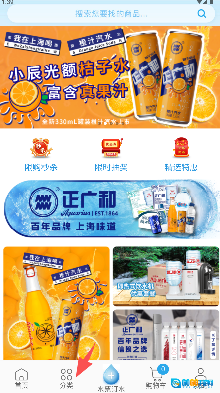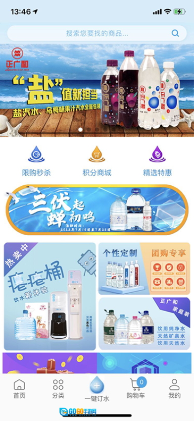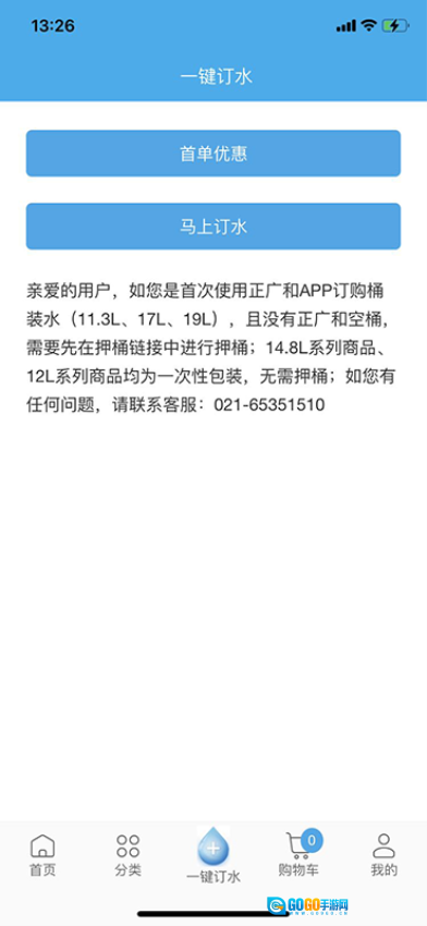 提供全面的桶装水线上订购服务,用户可对常规桶装水分类下的各类水种进行浏览和选购。