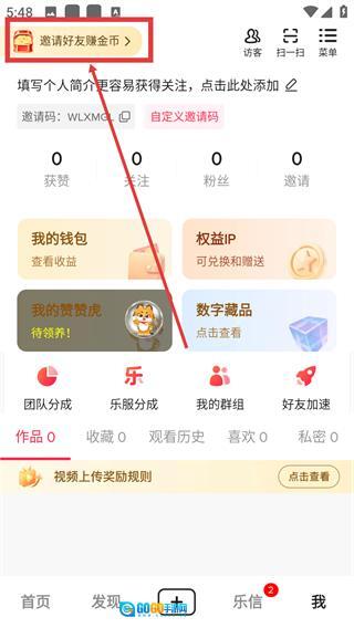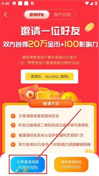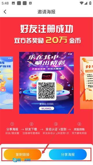 进入个人中心后,点击页面顶部的【邀请好友赚金币】按钮,即可进入邀请好友的活动界面。
