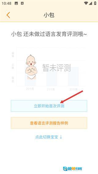 进入语言发育页面后,点击【立即开始首次评测】按钮,即可进入该宝宝的评测准备界面。