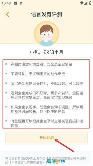 在评测准备页面浏览注意事项后,点击【开始评测】按钮,即可进入与宝宝当前月龄对应的语言发育评测题目界面。