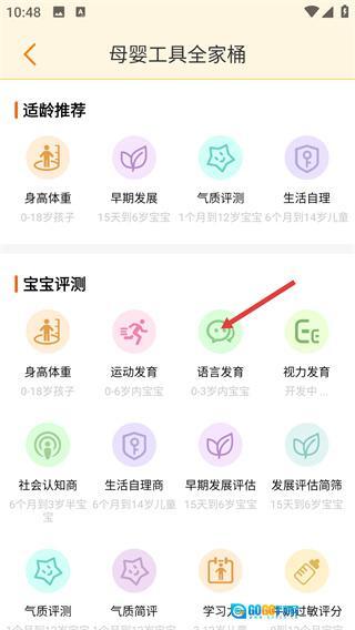 进入母婴工具全家桶页面后,找到并选择【语言发育】这一选项,即可进入针对0-3岁宝宝的语言发育评测界面。