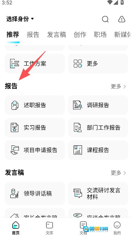 打开软件,在推荐页面找到报告分类并点击进入。