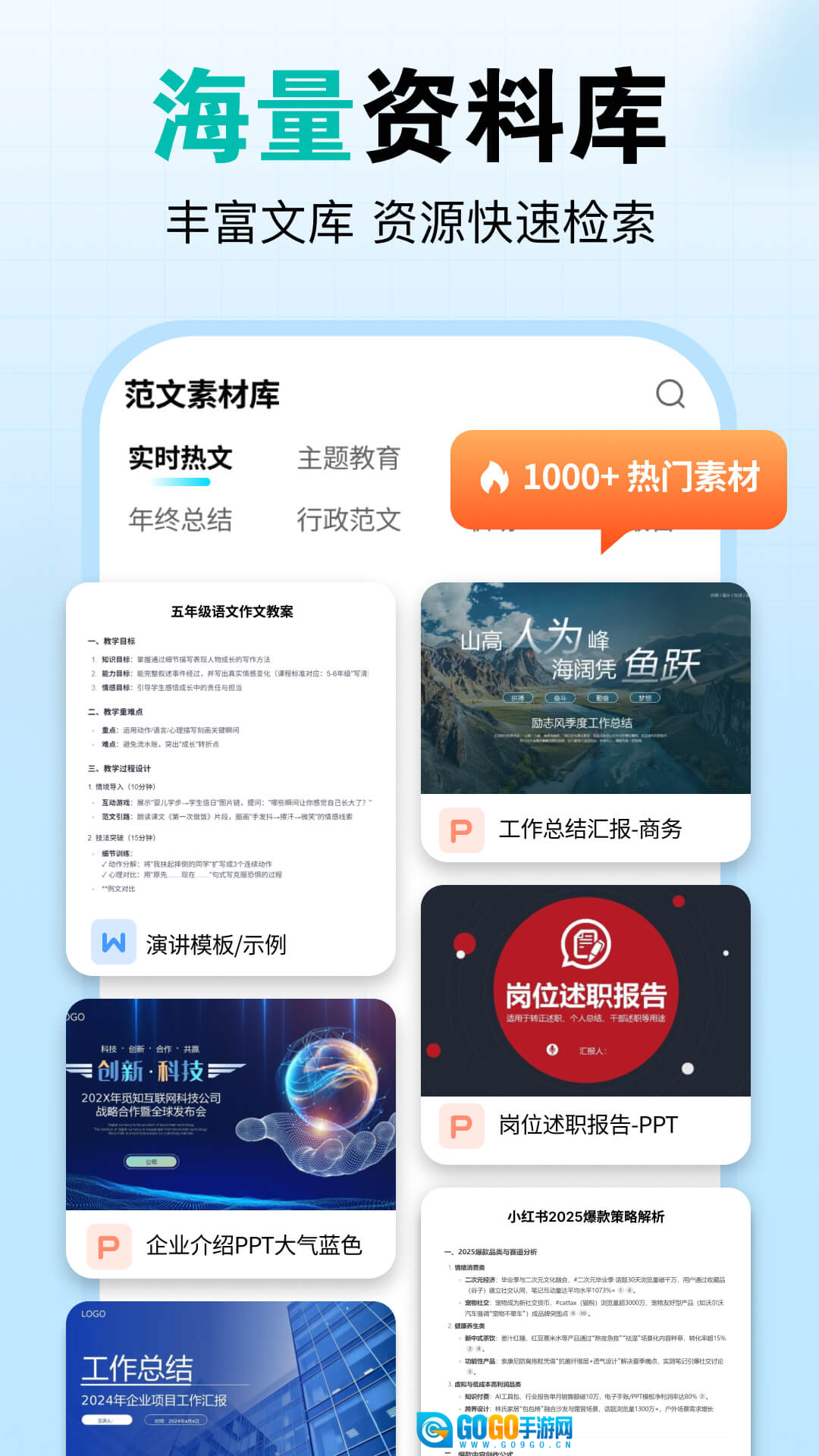 提供多种文本模板供选择,覆盖工作方案、述职报告等类型,能够满足不同场景下的文字创作需求。