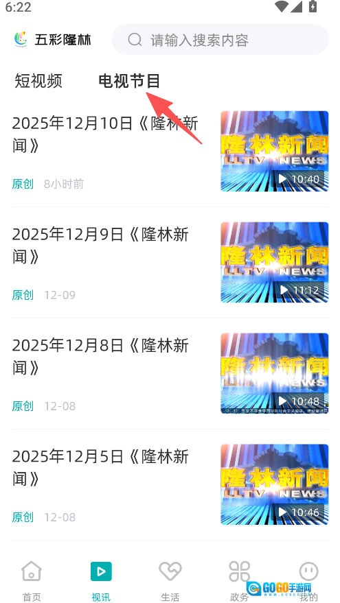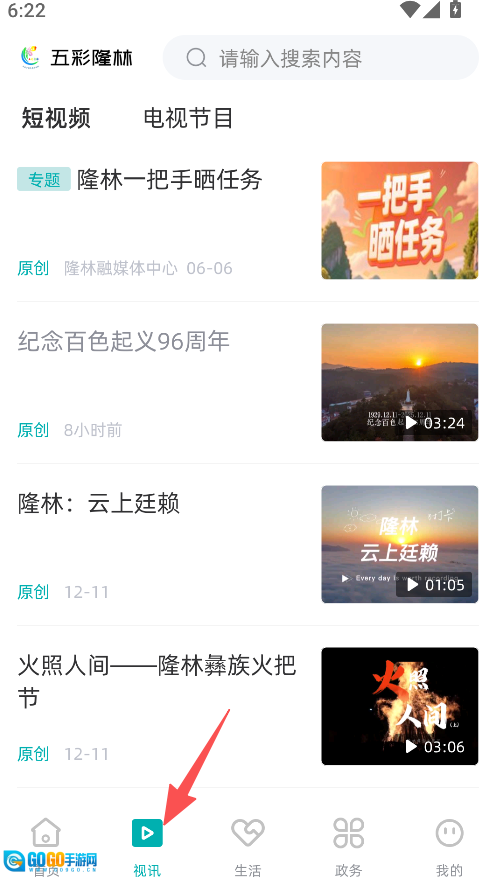 打开进入视讯板块,可切换短视频或电视节目分类。