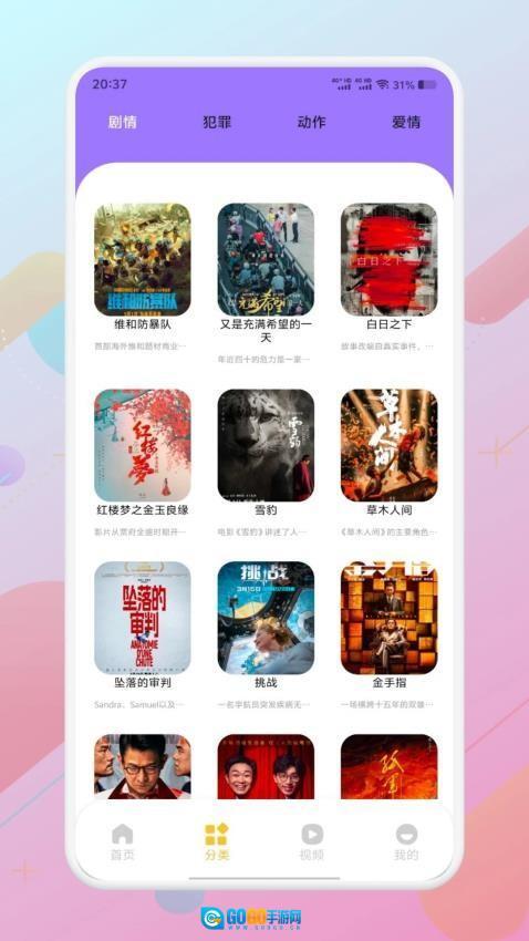 影视剧资源依据题材进行了清晰的分类,包含爱情、动作、犯罪等不同类型,方便用户快速筛选出自己喜爱的内容。