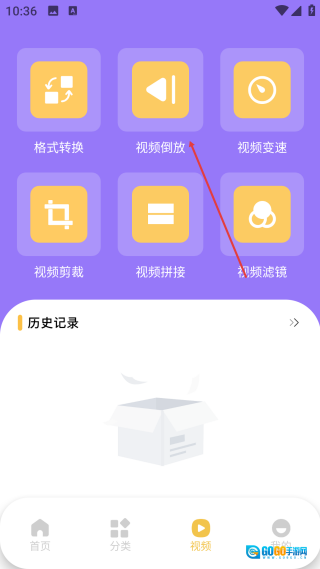 在功能页面中,点击【视频倒放】这一选项,即可进入相机胶卷的视频选择界面。