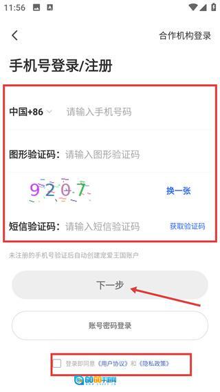进入手机号登录或注册界面,依次填写手机号、图形验证码和短信验证码,勾选相关协议后点击“下一步”按钮。